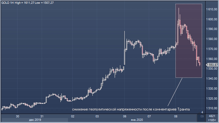 Первоначально нефть и золото взлетели в цене, а рисковые активы были под давлением после ракетного удара Ирана по американским базам в Ираке. Однако президент США в телеобращении к гражданам США снизил градус геополитической напряженности, сообщив, что жертв среди американского персонала баз и иракских граждан не было. Анонсировав новые экономические санкции против Ирана, и отметив, что именно Тегеран делает шаги в направлении деэскалации конфликта, Трамп дал понять, что военного ответа не будет. Это успокоило рынки.