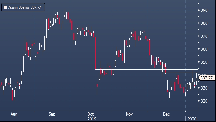 Акции Boeing сформировали суточный максимум на $341.71 за штуку. Но после отскочили на фоне фиксации прибыли, не сумев преодолеть сильную техническую область сопротивления между максимумом 23 декабря и закрытием после обвала 18 октября, когда авиакомпания написала в адрес Комиссии по ценным бумагам, что будет вынуждена приостановить или сократить выпуск авиалайнеров 737 MAX в случае значительных задержек в возобновлении эксплуатации самолетов.