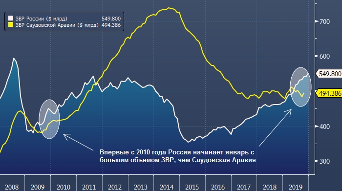 По состоянию на конец 2019 года, международные резервы Российской Федерации составили $550 млрд долларов, а Саудовской Аравии - $494.5 млрд. Отметим, что золотовалютные резервы (ЗВР) Банка России превзошли резервы ЦБ Саудовской Аравии впервые за последние 10 лет (по состоянию на январь).