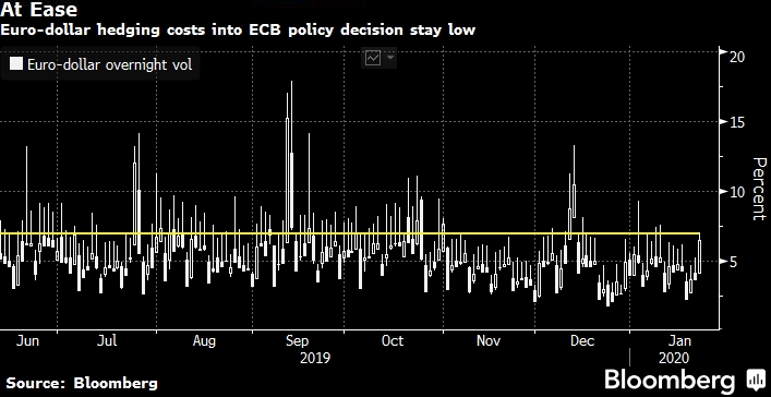 Спрос на ночную (овернайт) волатильность в евро/долларе остается подавленным, поскольку за последние две недели он снизился, а крупнейший в истории обзор стратегии Европейского центрального банка не смог взволновать трейдеров опционов. Волатильность однодневных контрактов на евро выросла на 338 б.п. до уровня 7.01%, после чего скорректировалась до 6.60%. 11 декабря, за день до первой встречи Кристины Лагард на посту президента, она вырастала до 11.23%.