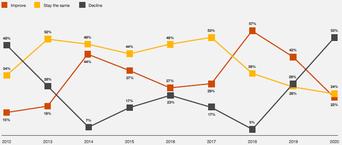 53% глав компаний ждут снижения темпов роста мировой экономики роста в этом году, что является рекордным числом с 2009 года, следует из результатов опроса, проведенного PricewaterhouseCoopers. В нем приняли участие 1581 руководитель компаний, и лишь 27% из них полагают, что этот год окажется успешным (ProFinance.ru: красная линия на графике в начале статьи отражает процент оптимистов, черная — пессимистов, а желтая - «без изменений»).