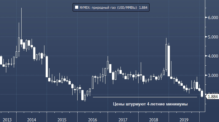 Природный газ в США дешевеет вторую неделю подряд. Стоимость фьючерсов на этой неделе впервые с 2016 года опустилась ниже 2 долларов за миллион британских тепловых единиц (MMBtu) и сформировала минимум на $1,81/MMBtu. Это всего на 20 американских центов выше минимума, установленного в августе 1998 года. Обычно в текущий период года наблюдается пиковое потребление газа. Однако необычайно теплая погода привела к сокращению спроса и оказала давление на цены.