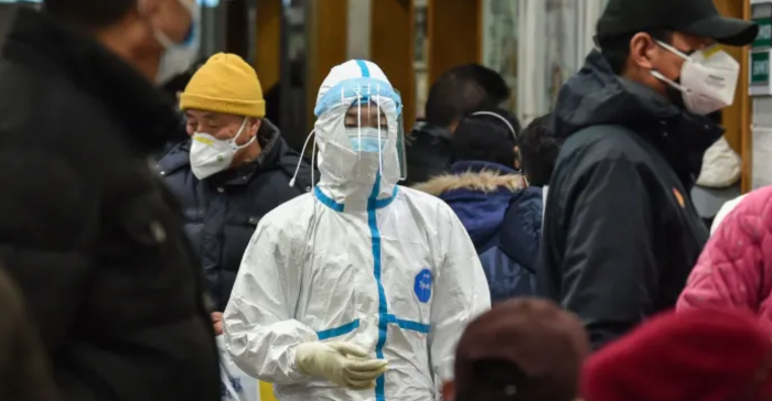 На фото: медработник в г. Ухань, Китай, в защитном костюме