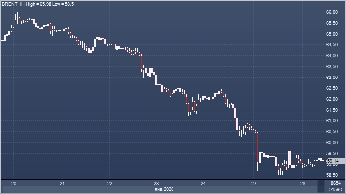 Опасения относительно распространения новой вирусной инфекции, ограничения перемещения людей в Китае и экономических перспектив уже привели к падению цен на нефть приблизительно на 10% с начала прошлой недели. Сегодня утром, 28 января, ситуация слабо стабилизировалась: нефть WTI -0.02% к уровням закрытия предыдущего дня, торгуется в районе $53.12 за баррель. Нефть Brent: -0.19% до $59.21 за баррель.
