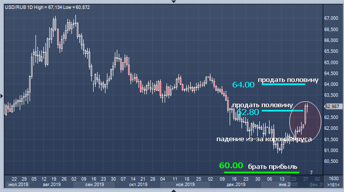 Банк рекомендует разделить позицию на две части: половину купить на 62.8, половину — на 64.00 (если рубль опустится до этой отметки), а прибыль следует фиксировать на уровне 60.
