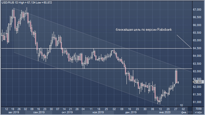 Эксперты Rabobank предсказывают в краткосрочной перспективе восходящее движение в паре доллар/рубль вплоть до 64.49. Технически область этой отметки является максимумами ноября и декабря 2019 года. Очевидно, для начала паре придется закрепиться выше уровня 63 рубля за единицу американской валюты.