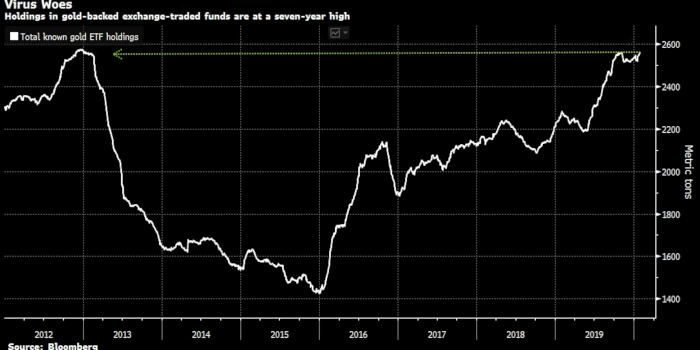 Последний приток в ETF, обеспеченные слитками, последовал за четырьмя годами притока подряд, и происходит он по мере того, как цены на желтый металл приближаются к самому высокому с 2013 года уровню. Число подтвержденных случаев заболевания вирусом в Китае резко возросло, превзойдя официальное число случаев заражения во время эпидемии атипичной пневмонии, и по меньшей мере 132 человека погибли.