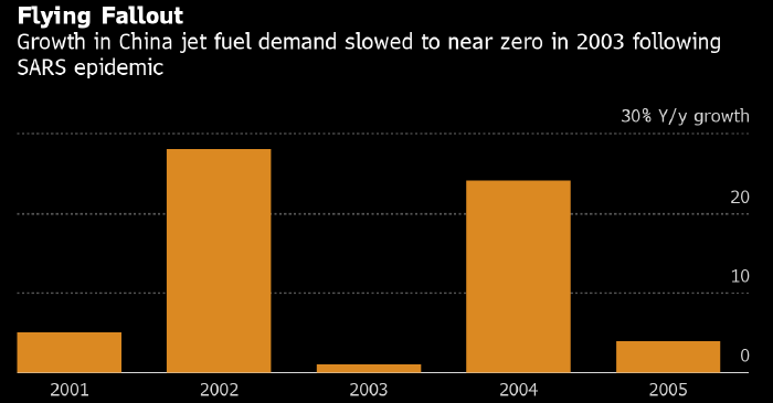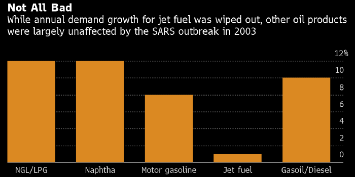 Вспышка эпидемии SARS (ProFinance.ru: Тяжёлый острый респираторный синдром или атипичная пневиония) в 2003 году действительно спровоцировала падение спроса на нефтепродукты, пишет Bloomberg со ссылкой на данные Международного энергетического агентства (МЭА). Резко снизилось потребление авиационного топлива, а спрос на другие нефтепродукты пострадал не так сильно (ProFinance.ru на графике ниже показана динамика роста спроса на нефтепродукты за 2003 год).