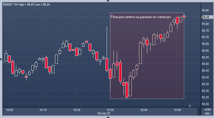 Реакция цен на нефть на данные была незначительной, как по времени, так и по масштабу. Цена Брент снизилась с уровня 59.46 до 59.24 в течение первых шести минут после выхода отчета, а потом выросла до 59.70. Реакция первых шести минут была связана с отчетом и объясняется сильным падением спроса на сырье со стороны НПЗ и превышением запасов сырой нефти — тем более, что вчера Американский институт нефти сообщал о падении запасов, по его собственным данным, на целых 4.27 млн баррелей.