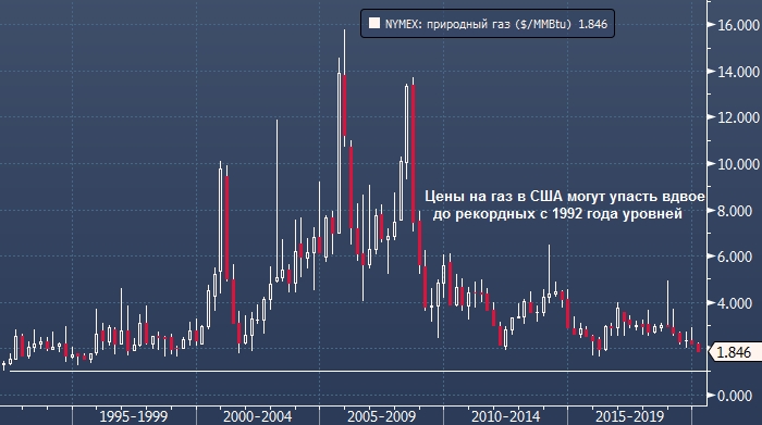 Если американским энергетикам не удастся в этом году сбалансировать рынок, то цены могут упасть ниже $1 за млн британских тепловых единиц, предупреждает Bank of America (см. график в начале статьи). По мнению экспертов банка, только это сможет заставить производителей сократить добычу.