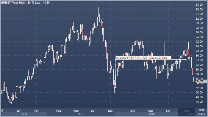 Средняя цена североморского сорта Brent, построенная на основании рыночных котировок фьючерсов за январь 2020 года, составляет $63.91 за баррель. При этом средняя цена Brent по итогам 2019 года составляет $64.14 за баррель.