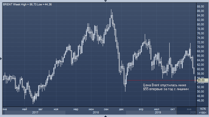 Вечером понедельника фьючерсы на нефть Brent и WTI опустились ниже отметок $55 и $50 за баррель соответственно, что произошло впервые более чем за год.