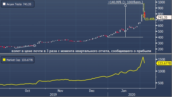 Вчера акции Tesla взлетели до $969 за штуку, намекая своими темпами роста, что статус Toyota, как самого дорогого автопроизводителя в мире с капитализацией свыше 200 млрд, находится под угрозой. Однако сегодня бумаги Tesla от вчерашних максимумов теряют в цене уже более 25%. Компания была на слуху во всех уголках финансового сообщества на планете, вызывая споры о перекупленности и формировании пузыря в отдельных акциях и даже целых отраслях.