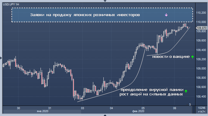 USD/JPY может вырасти выше 110, если иена продолжит снижение на фоне ослабления опасений по поводу вспышки вируса. Розничные инвесторы размещают заказы на продажу со 110 до январского максимума около 110.29, и у рынка в настоящее время нет сил, чтобы преодолеть такие заявки. Нельзя быть слишком оптимистичным в отношении быстрой разработки вакцины от нового вируса.