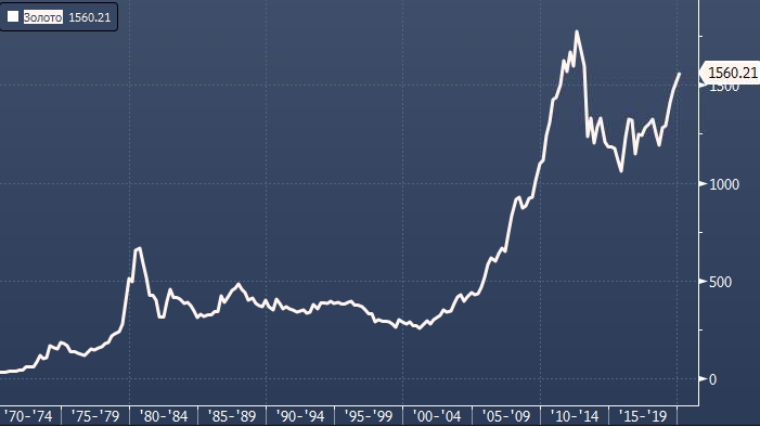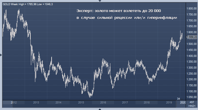 Теперь позвольте мне показать вам целевую цену в 20 000 за унцию золота. Если немного вернуться к 1970-м годам, цены на слитки золота составляли около 40 долларов за унцию. А потом с 70-х по 1980-е годы они поднимались до уровней около 600 долларов за унцию. Это 15-кратное увеличение за 10 лет, в чем разница между 70-ми годами и сейчас? В 70-х годах уровень инфляции был чрезвычайно высок, поэтому золото было защитой от инфляции. Если мы увидим комбинацию в виде спада экономики и инфляции, это будет уже стагфляция. В этом случае я вижу золото на уровне 20 000. Поскольку центральные банки потеряют контроль над происходящим, деньги потеряют стоимость. Веймарская республика и гиперинфляция напомнят о себе. И вот, у вас есть золото по 20 000 за унцию в течение нескольких лет. Так что это явные возможности, и я бы даже сказал, что уверен, что это произойдет.