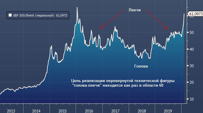 К настоящему моменту соотношение S&P 500 и нефти Brent реализовало техническую цель перевернутой фигуры «голова-плечи» в области 60 (см. график ниже) и тестирует 20-летнее сопротивление. Любителям торговать на отскок мы рекомендуем продавать S&P 500 (текущее значение 3345) и покупать Brent (текущая цена $54.66).