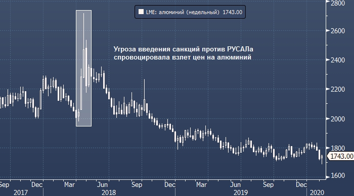 В 2018 году угроза введения санкций в отношении «Русала» Олега Дерипаски сотрясла товарный рынок. В апреле того года цены на алюминий за три недели взлетели на треть (ProFinance.ru: см. график в начале статьи), и рынок долго продолжало лихорадить в перманентном санкционном ожидании.