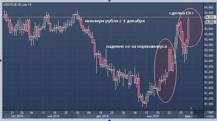 Рубль вечером пятницы обновил 2-месячные минимумы, лишившись более 1% стоимости на фоне негативной динамики сырьевых и развивающихся валют по всему миру. Нефть, которая оказала дополнительное давление, незначительно теряла в цене из-за нежелания России спешить с сокращением добычи, к чему ее призывает ОПЕК+. Локальный валютный спрос участники рынкасвязали с конвертацией валюты En+ для выкупа своих акций у банка ВТБ. Свою роль вечером играет и желание закрыть позиции в рискованных активах и валютах на выходные дни, чреватые ростом показателей вспышки инфекции коронавируса в Китае.