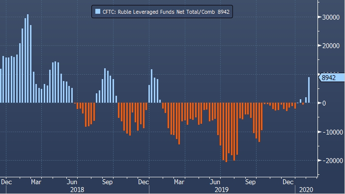 Если оценить статистику CFTC по рублю более подробно, то можно отметить, что сальдированная позиция тех участников рынка, которые торгуют с кредитным плечом (leveraged funds), вторую неделю кряду остатся длиной и достигла максимума с 1 недели января 2018 г. Как видно из представленной диаграммы, нетто-лонг увеличилс до 8 942 контрактов на отчетной неделе.