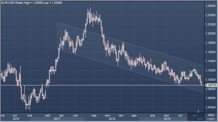 Курс евро по отношению к доллару на торгах в среду, 12 февраля, снизился до 1.0877 — самого низкого уровня с мая 2017 года. Давление на единую валюту оказывают опасения становления рецессии в экономике Германии из-за коронавируса. Сегодня были опубликованны данные по промпроизводству в еврозоне по итогам декабря, которые оказались хуже прогнозов и отразили спад в промышленности региона. В пятницу будет опубликована предварительная оценка экономического роста Германии в 4 квартале 2019 г. Согласно консенсус-прогнозу экономистов, ВВП вырастет всего лишь на 0.1% к предыдущему кварталу и на 0.2% без учета сезонных колебаний к аналогичному кварталу годом ранее.