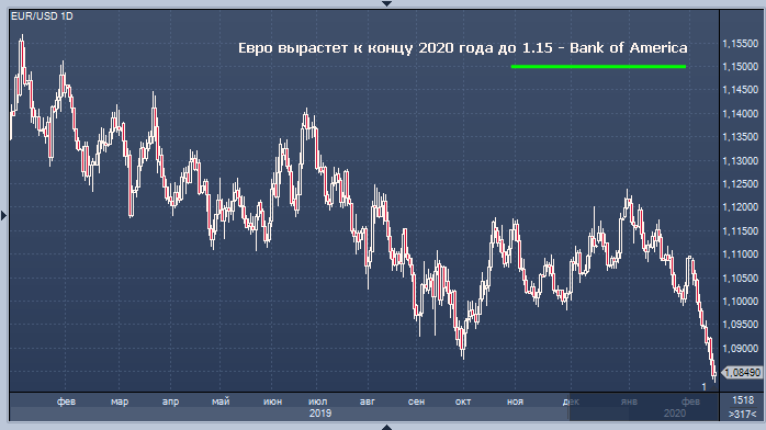 BofA ожидает, что курс евро/доллар завершит 2020 год на уровне 1.15 вместо 1.0848 в настоящее время.