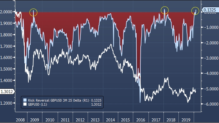 Трейдеры рынка валютных опционов не были столь оптимистичны в отношении курса фунта стерлингов, по крайней мере, 2 года, если судить по 3-месячному показателю Risk reversal. Для его расчета учитываются премии опционов Call и Put «около денег» с дельтой 25. Положительное значение Risk Reversal говорит о том, что премия опционов Call выше премии опционов Put. Чем выше значение Risk Reversal, тем более рискованной считается контрвалюта.