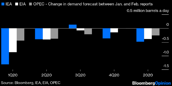 Сравнение прогнозов трех крупнейших мировых нефтяных агентств (Международное энергетическое агентство (МЭА), Минэнерго США и ОПЕК) говорит о серьезной неопределенности относительно того, как вспышка коронавируса повлияет на спрос на нефть.