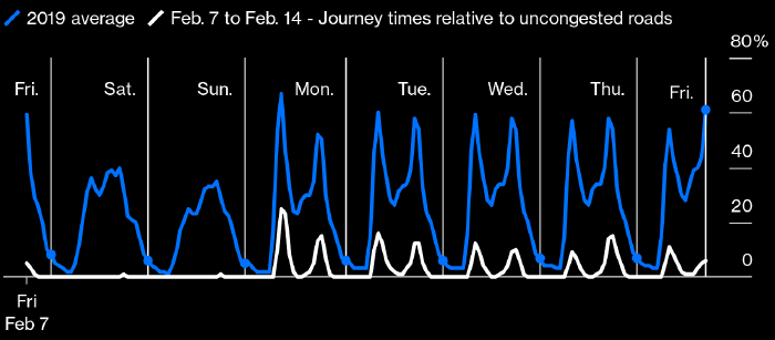 Оценки ОПЕК излишне оптимистичны, и вот почему. Потребление черного золота в Китае резко снизилось на фоне закрытия промышленных предприятий и почти полной остановки туристических потоков. Загрузка дорог в крупнейших городах Поднебесной остается в разы ниже нормы (ProFinance.ru: на графике ниже отражена статистика TomTom по загруженности дорог в Шанхае с 7 по 14 февраля. Синия линия — данные за 2019 год, а белая — за текущий), и эксперты BloombergNEF подсчитали, что количество вылетов из аэропортов страны с момента вспышки коронавируса сократились на 80%, а спрос на керосин - на 0.24 млн б/д.