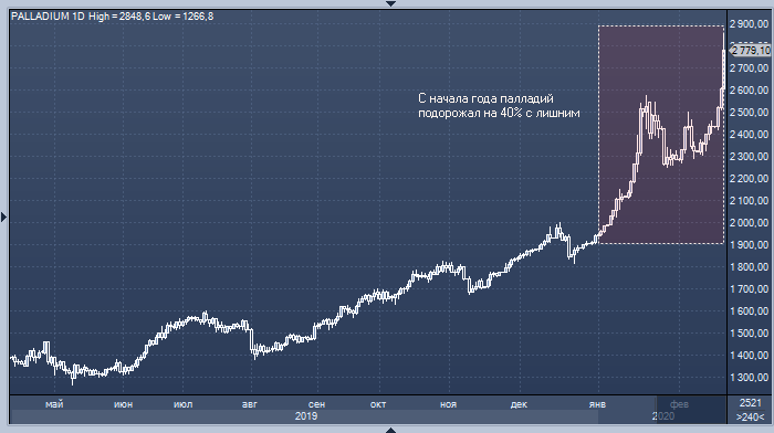 Под закрытие азиатской сессии среды цена палладия за 30 минут взлетела на $100 и достигла новых рекордных значений в области $2850 за унцию. Вчера вечером котировки прорвались выше предыдущего исторического максимума от 20 января в области $2575.