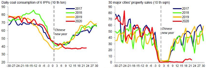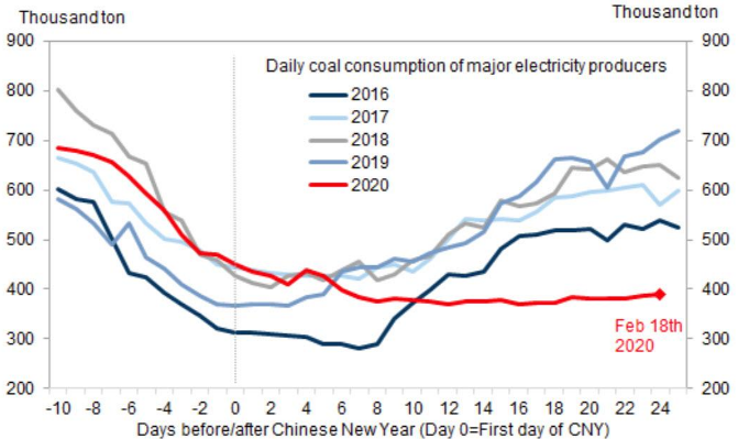 Эксперты Goldman Sachs проанализировали данные по производству готовой продукции, спросу на сталь и ее запасам, потреблению угля и продаже недвижимости в Китае, а также еще несколько показателей и пришли к выводу о том, что экономическая активность в Китае не превышает 50% от средних показателей прошлых лет (ProFinance.ru: график выше отражает динамику потребления угля крупнейшими электростанциями Китая (в тысячах тонн) за 2016-2020 годы. Цифры внизу графика обозначают количество дней до/после Китайского нового года).