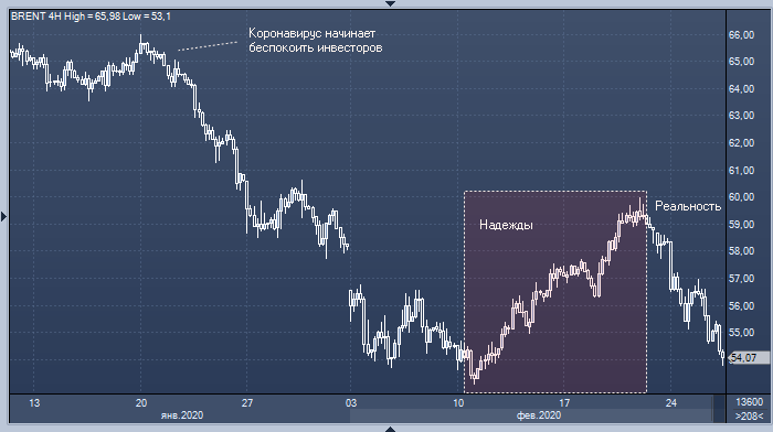 С начала года нефть Brent подешевела почти на 20%. С 20 января котировки ускорили падение на фоне роста опасений того, что распространение коронавируса нанесет серьезный удар по мировой экономике. 11-20 февраля цены корректировались вверх из-за надежд на то, что эпидемия не выйдет за границы китайской провинции Хубэй. Как только выяснилась их необоснованность, котировки возобновили снижение.