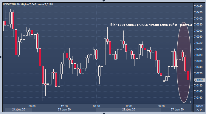 В четверг курс юаня вырос, так как Китай сообщил о самом медленном ежедневном росте смертности от коронавируса почти за месяц, в то время как по всему свету, напротив, число инфицированных растет, отвлекая некоторое внимание от проблем второй по величине экономики мира. На Китай по-прежнему приходится 96% случаев заражения, но о большинстве новых инфекций в настоящее время сообщается в других странах. В четверг новости о скачке заболеваний в Южной Корее сопровождаются предупреждением о том, что вирус может распространяться в Калифорнии.