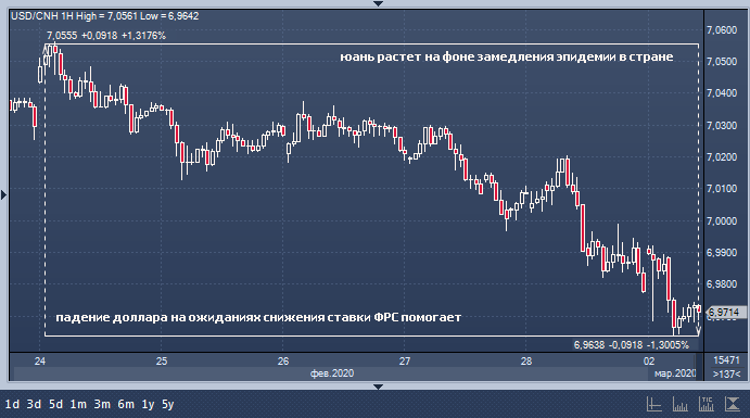 «Рост ожиданий снижения ставки ФРС и улучшение внутренней ситуации (в том, что касается сдерживания распространения вируса) поддержали юань», — сказал трейдер в китайском банке.