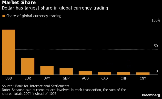 Доля доллара в мировом валютном обороте, по данным Банка международных расчетов, более чем в пять раз превышает долю иены и почти в три раза больше доли евро.