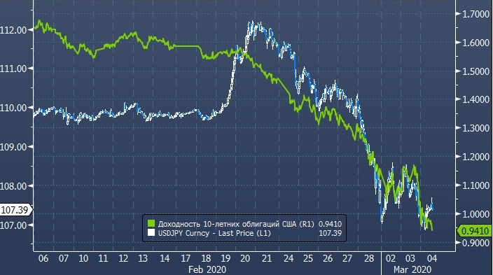 График доллар/иены и доходности 10-летних облигаций США наглядно показывает степень корреляции данных инструментов