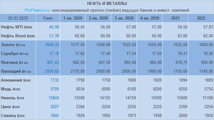 В целом прогнозы ухудшились из-за коронавируса и по результатам обвального падения цен в феврале. Нефть Brent в начале последнего месяца зимы стоила около $55 за баррель. На конец 1 квартала консенсус подразумевал $63.50 за баррель. В конце февраля Brent падал до $50 за баррель и в начале марта стоил $51.40, но прогноз на конец марта уже подразумевает $60.70 за баррель.