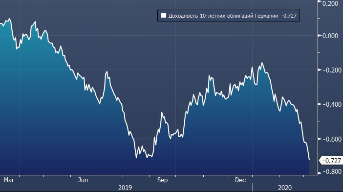 Доходность 10-летних облигаций Германии в пятницу упала до нового шестимесячного минимума, приблизив к рекордным минимумам, достигнутым в прошлом году, поскольку вспышка коронавируса продолжала волновать мировые рынки.