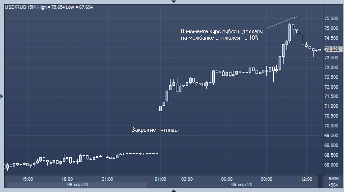 На закрытии торгов в пятницу за доллар давали 68.5 рублей, однако сегодня цена нефти рухнула на 20%, что спровоцировало обвальное падение рубля на межбанковском рынке.