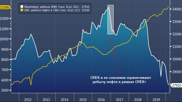 В 2014 году ОПЕК объявила войну американским производителям сланцевой нефти, добыча которых неуклонно росла и давила на котировки. Картель решил защитить свою долю рынка и разорить сланцевиков. Ценовая война краткосрочно отправила Brent и WTI ниже $30 за баррель, и в то время я писал, что это будет стоить ОПЕК триллиона долларов или даже больше.