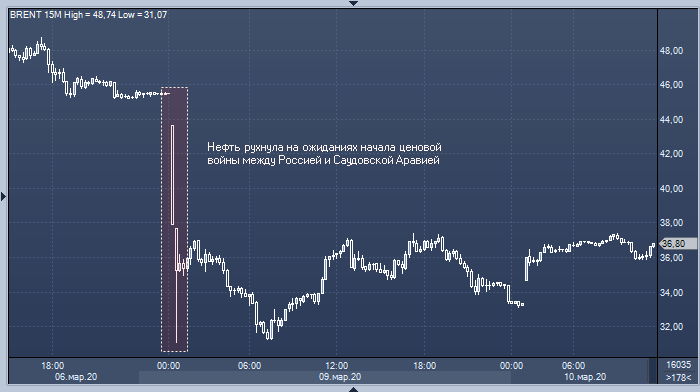 Напомним, что в пятницу в Вене прошла встреча участников соглашения ОПЕК+, по результатам которой сторонам не удалось ни согласовать более глубокое сокращение добычи нефти, ни пролонгировать само соглашение. Россия вышла из ОПЕК+, в субботу Саудовская Аравия предложила азиатским покупателям беспрецедентный дисконт на свою нефть, и в понедельник котировки черного золота рухнули на 25% на ожиданиях начала ценовой войны между РФ и Саудовской Аравией.