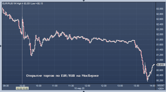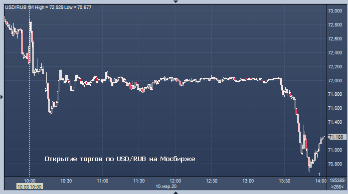 Таким образом, по официальному курсу ЦБ доллар вырос к рублю 4 рубля и 51 копейку, а евро вырос к рублю 6 рублей и 1 копейку по сравнению с официальным курсом субботы. Объем торгов на Московской бирже к 14:02 мск вторника составил 1 344.7108 млрд рублей или 19 916.4774 млн долларов. Курс рубля сегодня рухнул на фоне разгорающейся нефтяной войны Саудовской Аравии, США и России, приведшей к обвалу нефтяных цен в понедельник на 30%, а также на фоне обвального падения мировых рынков акций из-за распространения коронавируса в развитых странах, тяжелых человеческих потерях в странах Европы.