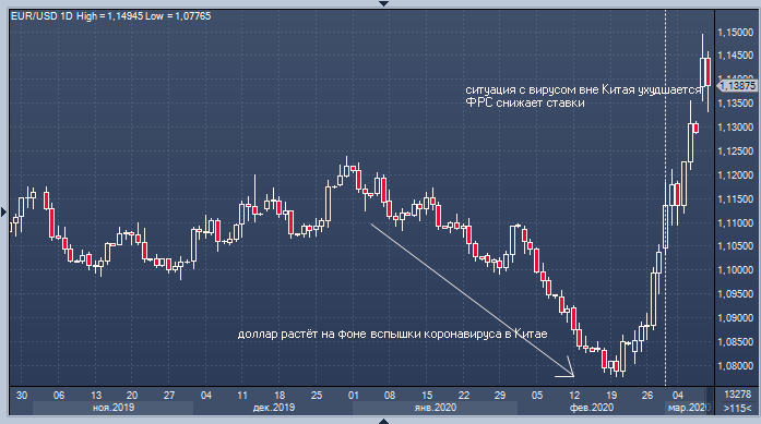 Эпидемия коронавируса в Китае и её негативный эффект на мировую экономику повлекли за собой исход инвесторов в надежные активы и укрепление позиций доллара, однако по мере того, как вирус распространялся по планете и добрался до США оценка перспектив стала меняться. Неожиданное снижение ставок ФРС на прошлой неделе придало импульс снижению американской валюты, и многие аналитики полагают, что в ближайшем будущем тенденция к ослаблению доллара сохранится.