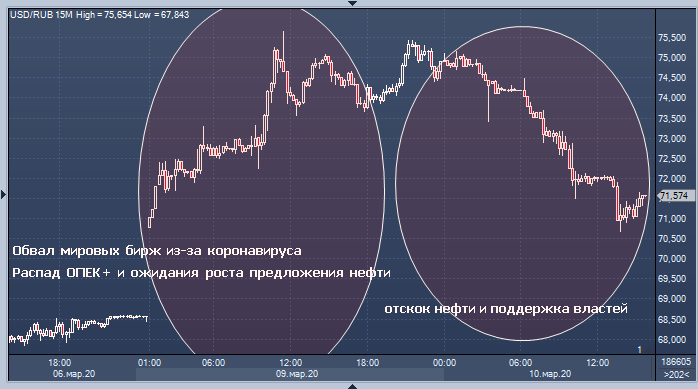 В понедельник рубль опускался ниже (выше по доллару) отметки 75.50, теряя в моменте 10%. К 15:43 мск вторника курс рубля скорректировался до 71.52 благодаря мерам поддержки властей, успокоению инвесторов и отскоку нефти.