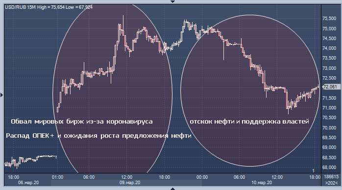 Первые проблемы у рубля начались из-за бегства капитала с развивающихся рынков на фоне распространения коронавируса. Далее проблемы стали только расти под влиянием дешевеющей нефти, обвала на рыках акций и бегства в облигации развитых стран. Нефтяное пике к 4-летним минимумам после разрыва сделки ОПЕК+ и решения Саудовской Аравии резко увеличить добычу и дать рынку скидки на свое сырье поставил точку в эпопее с рубле.