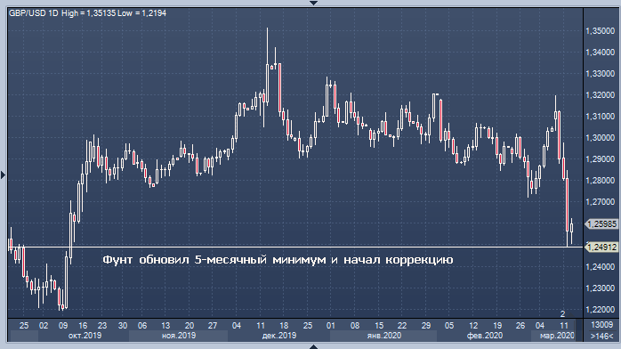 В начале торгов в пятницу британская валюта выросла на 0.4% до 1.2625 доллара после падения ниже 1.25 доллара до самого низкого уровня за пять месяцев в четверг. Фунт в значительной степени отслеживал волатильные движения на мировых рынках на этой неделе благодаря двойным мерам стимулирования Банка Англии и правительства Великобритании, включая снижение процентной ставки и миллиарды фунтов поддержки борющихся с кризисом фирм. Но эти меры предлагают только временную поддержку.