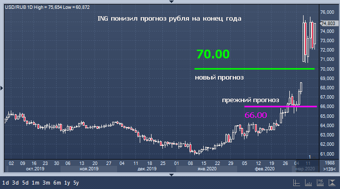 Прогноз рубля на конец года понижен до 70 за доллар с 66 за доллар по причине удешевления нефти.