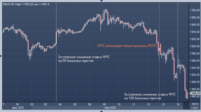 Новая неделя начиналась неплохо: котировки поднялись к $1575 на фоне новостей о том, что ФРС экстренно снизила целевой диапазон ставки по федеральным фондам с 1.00% — 1.25% до 0.00% — 0.25% и запускает программу покупок активов на $700 млрд. Однако улучшение динамики оказалось непродолжительным: скорый лимит-даун на рынке фьючерсов повлек за собой возобновление продаж на металла. Золото остается привлекательным активом-убежищем для инвесторов, но продолжающийся обвал на финансовых рынках вынуждает их ликвидировать прибыльные позиции в нём для покрытия убытков и поддержания маржи по позициям в других активах.