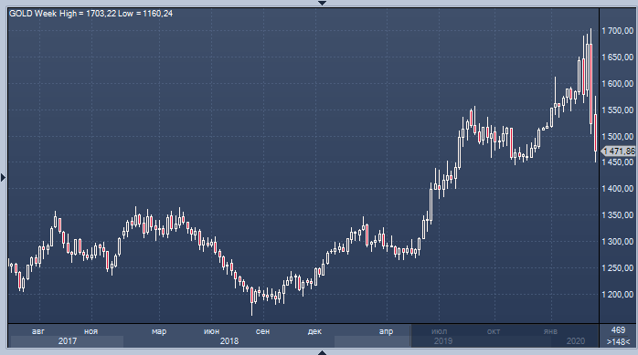 Цена золота на споте в понедельник 16 марта упала более чем на $50 за тройскую унцию, и в настоящее время металл пытается оттолкнуться от минимумов сессии в районе $1451, теряя более 4%.
