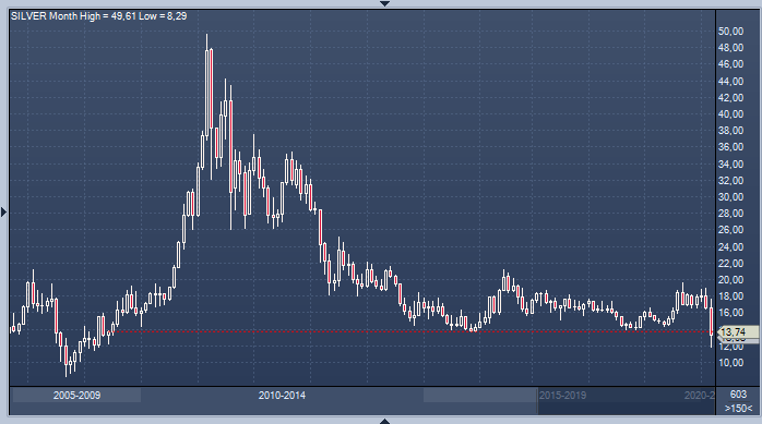 Как и золото, серебро ощутило на себе последствия масштабной распродажи на финансовых рынках, однако если первое корректируется после ралли к максимальным уровням с 2012 года, то последнее сегодня рухнуло к 11-летним минимумам.
