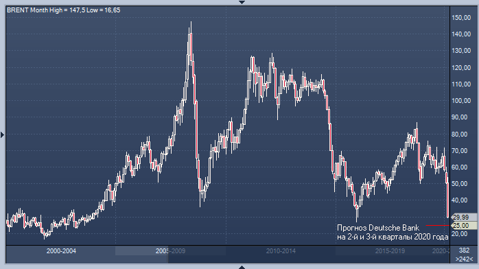 Deutsche Bank сообщил о снижении своего прогноза по средней цене нефти марки брент на второй и третий кварталы с $53 до $25 за баррель, при этом в банке не верят в быстрое восстановление спроса. Даже если распространение коронавируса прекратилось бы завтра, цепная реакция негативных последствий пандемии на спрос продолжилась бы.